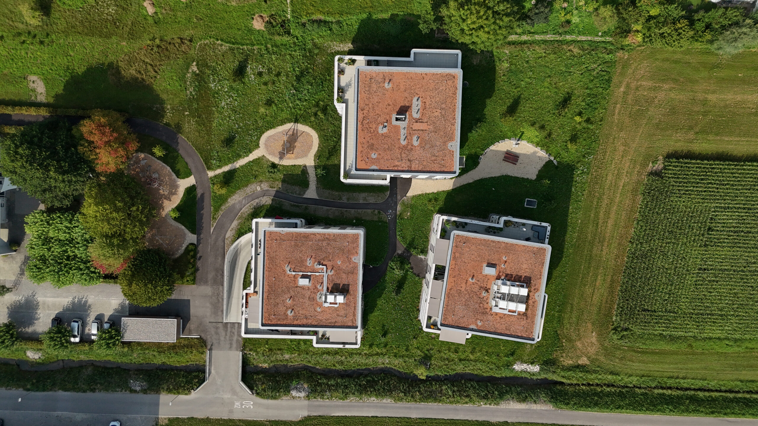 Die Gemeinde und die Kirchgemeinde Toffen wollten auf ihren Grundstücken an bester Lage gegenüber von Schulhaus und Kirche bezahlbaren Wohnraum schaffen. Hierzu wurde zu Beginn im Rahmen von partizipativen Workshops zusammen mit der Bevölkerung das Anforderungsprofil an die Überbauung geschärft. Der Fokus sollte auf Wohnraum für Familien und für ältere Menschen, die beispielsweise ihr Einfamilienhaus Verkaufen wollen, liegen. Und genau das konnte erfolgreich umgesetzt werden: Entstanden ist eine Wohnüberbauung mit drei Mehrfamilienhäusern und grosszügig gestalteten Freiräumen, die sich mit dem Aussenraum der benachbarten Kirchgemeinde vernetzen und teilweise gemeinsam neu gestaltet wurden. Die drei Häuser verfügen über eine stilvolle Architektur, naturverbundene Farbgebungen und wertige Materialien.
